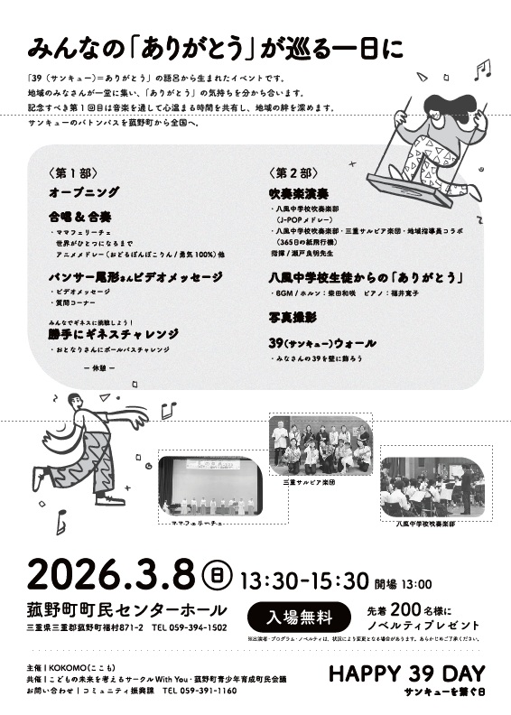 | 特別協力 | 八風中学校吹奏楽部、三重サルビア楽団、ママフェリーチェ |